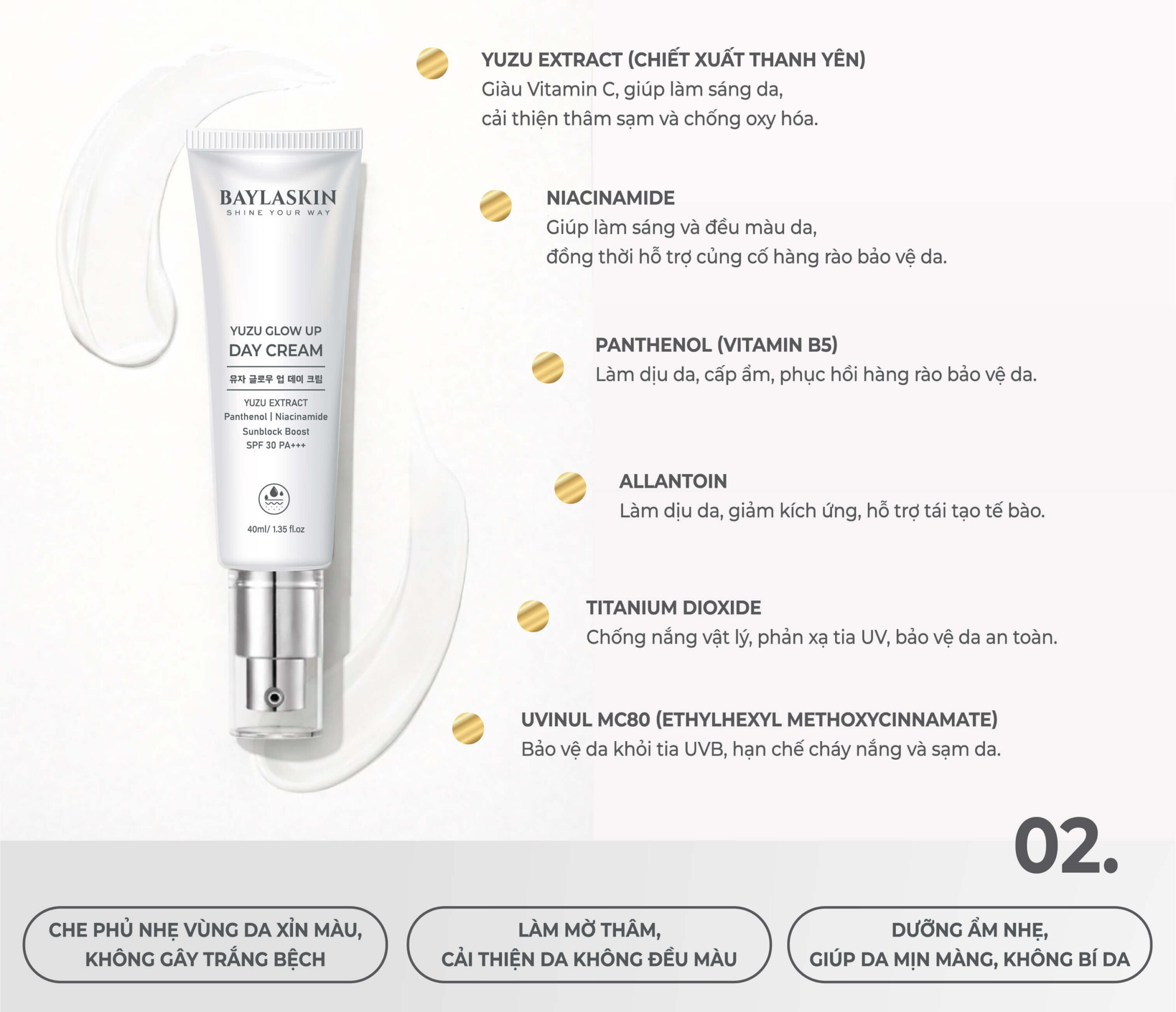Công thức chứa chiết xuất Yuzu giàu Vitamin C, kết hợp Niacinamide và Panthenol giúp làm đều màu da, cải thiện thâm sạm, đồng thời tăng cường hàng rào bảo vệ da trước tác hại của tia UV và môi trường. Kết cấu kem mỏng nhẹ, thấm nhanh, không gây bết dính hay nặng mặt, phù hợp sử dụng hằng ngày cho mọi loại da, kể cả da nhạy cảm.